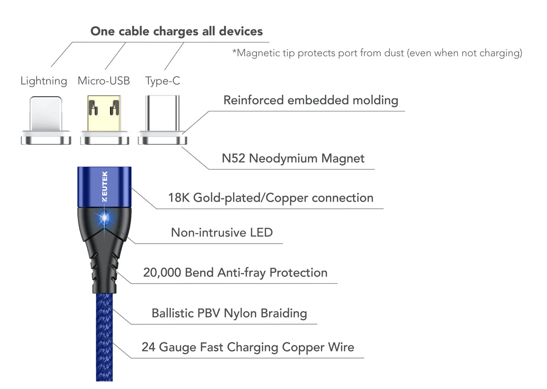 USB-A to magnetic Micro-USB, Lighting iOS or Type-C connection